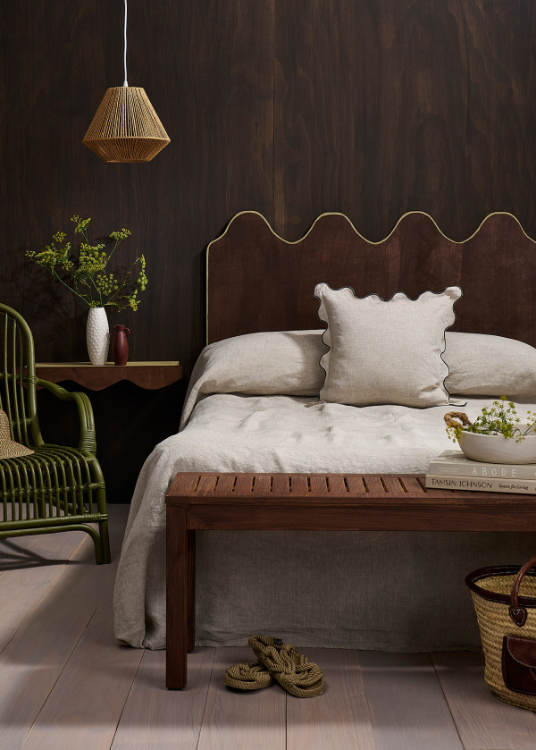 Walls stained in Resene Colorwood Charred Black, bedhead and floating shelf in Resene Colorwood Bark with contrast painted in Resene Colins Wicket and vase in Resene Waiouru. Linen from Kinship Linen, lightshade from Mitre 10. Project by Melle Van Sambeek, image by Bryce Carleton.