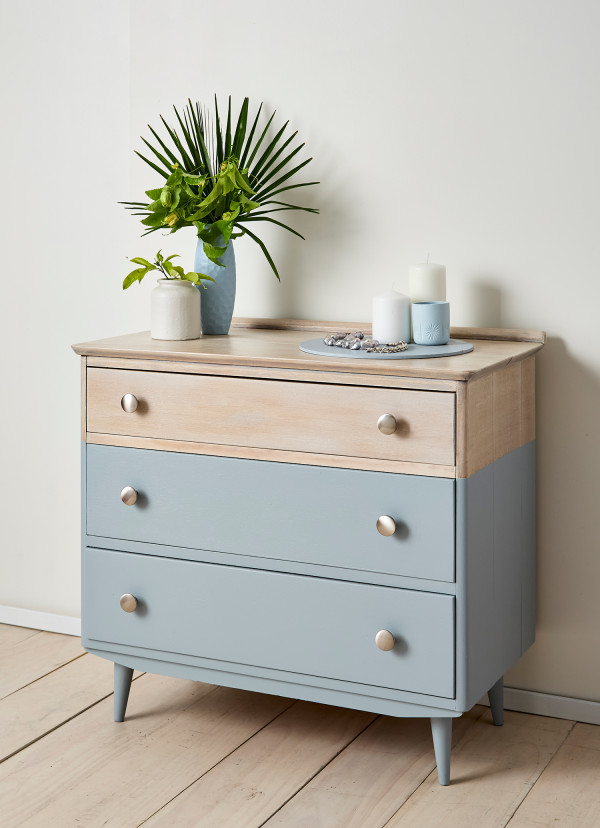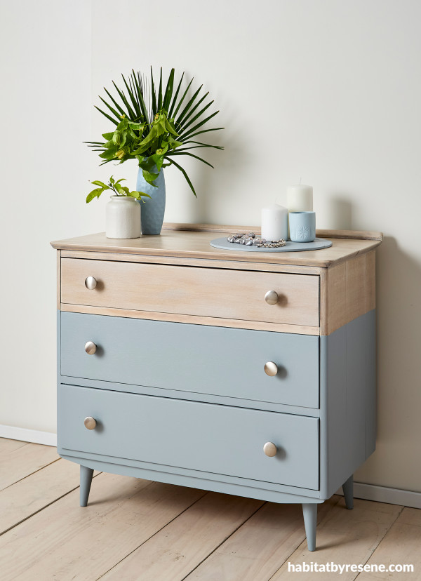 Lower drawers painted in Resene Lustacryl in Resene Clouded Blue with upper section finished in Resene Colorwood Whitewash. Vases in Resene Frozen and Resene Sea Fog, wall and skirting in Resene Sea Fog and floor stain washed in Resene Colorwood Breathe Easy. Project by Sarah Beedell, image by Bryce Carleton.