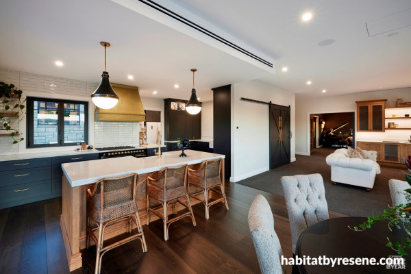 Belco Homes, Winner of Bay of Plenty & Central Plateau Supreme House of the Year Over $1 million, Resene New Home $2 million - $4 million category, Pink Batts Craftsmanship Award, Kitchen Excellence Award, and a Gold Award. In this charming open-plan kitchen, dining and living, the walls are painted in Resene Merino, trims in Resene Quarter Merino and ceiling in Resene Double Alabaster. Image by Amanda Aitken.