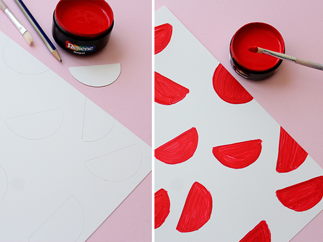 - Pencil around the half circle cut outs onto the A4 paper, creating the shape for the watermelon slices.