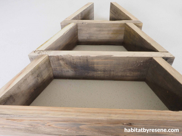 Step 1: For this project Fleur used wood from an old pallet but it could easily be made out of new store-bought pine. Fleur’s pallet wood was 9.5cm wide and 2cm thick. First cut the three shelves by setting your mitre saw to cut at 25 degrees and make the bottom shelf a length of 48cm, with the two cut ends angled in. Cut the middle shelf to a length of 38cm from longest point to longest point and cut the top shelf to 28cm from longest point to longest point.