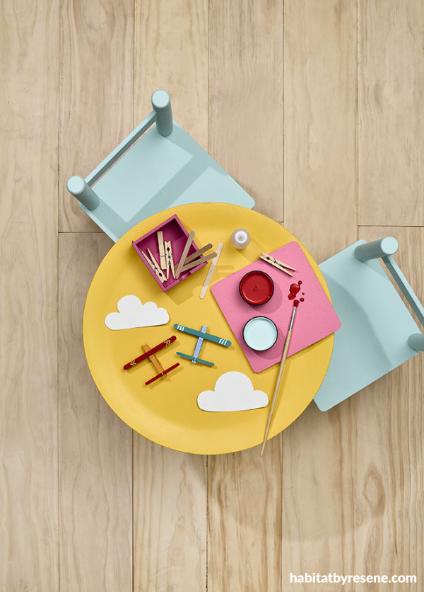 Fly high with these cute wooden planes. Red plane in Resene Guardsman Red, Resene West Side and Resene Bright Spark, blue plane in Resene Surfie Green, Resene Pattens Blue and Resene Charlotte and clouds in Resene Rice Cake. Flooring in Resene Colorwood Natural, chairs in Resene Reservoir, table in Resene Bright Spark, pink painting mat in Resene Glamour Puss and pegbox in Resene Rouge.