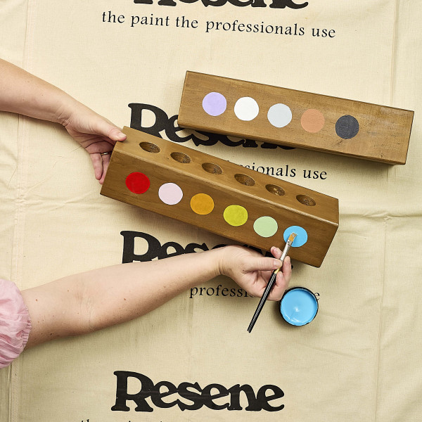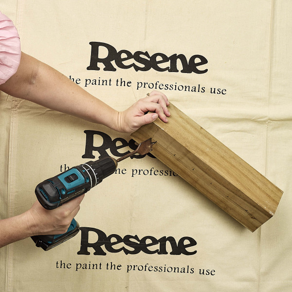 Step two: Sand the wood pieces, including the holes then wipe with a damp cloth. Stain all the wood pieces in Resene Bask. Leave to dry.