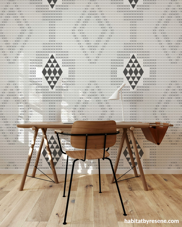 This minimal office has some added texture with a wall in Resene The Icon Edit Black & White Wallpaper Collection 64503. The wooden floor and desk ground the room and keep things simple and warm.