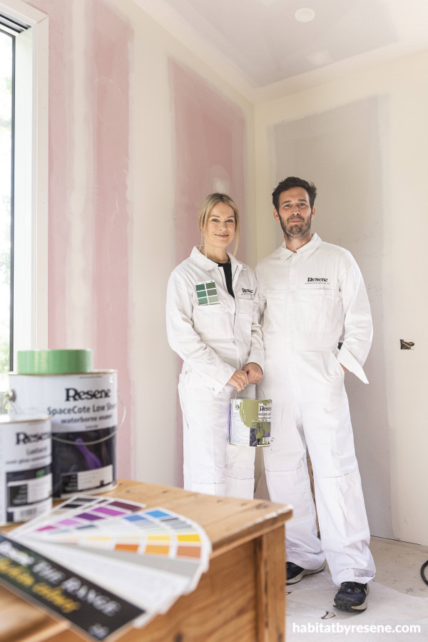 Ready for the job, Blair and Gretchen are well prepared with their Resene gear and chosen paint.