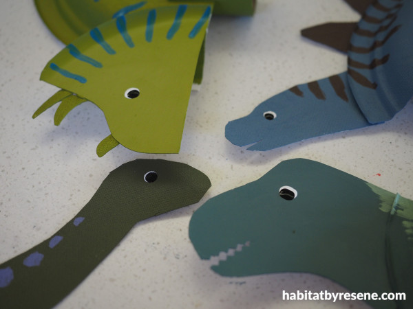 - Your choice of Resene testpots – Fleur used Resene Grass Hopper and Resene Blue Lagoon for the Triceratops, Resene Seachange and Resene Rebel for the Stegosaurus, Resene Green Meets Blue and Resene Amulet for the T-Rex, Resene Waiouru and Resene Reverie for the Diplodocus, and Resene White and Resene Black for the eyes.