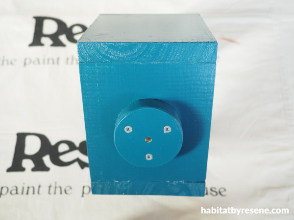 Sand all the rough edges smooth, wipe away any sanding dust, and then prime all your pieces of wood with one coat of Resene Quick Dry. Once this is dry, paint with two coats of your chosen colour. Fleur used Resene Teal Blue for her birdhouse.