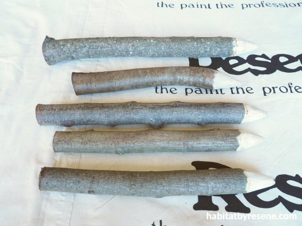 Step 1: Start by cutting some branches into short lengths. Fleur’s are about 22cm long. Sand one end down to form a point, and wipe away any dust.