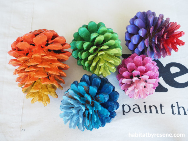 Step 1: Paint the pinecones with a graduated colour scheme. Start with one colour at the top of the pinecone and work your way to the base with two or three other colours. Don’t wash out your paint brush between colours, as the mixing of the two colours makes for a better gradient. You can make your pinecones as colourful as you like in any of your chosen shades. Here are the colours Fleur used: