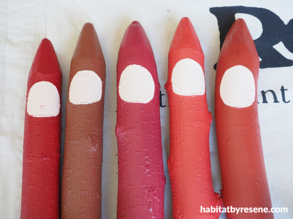 Step 2: Paint a circle for the face using Resene Romantic, and then paint the rest of the branch in your chosen red colour. Fleur used (left to right) Resene Red Berry, Mocha, Paprika, Del Toro and Raging Bull.