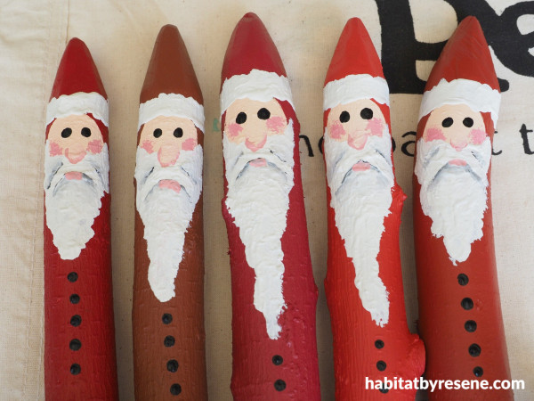 Step 3: Use Resene Rice Cake to paint on a fluffy trim around the hat and for the beard. Dab on Glamour Puss for the cheeks and use the end of a paint brush to dot on the eyes with Black.