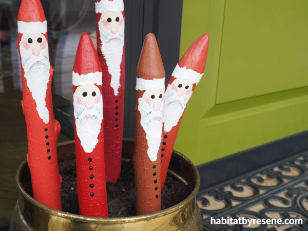 Step 5: Fill a pot, bucket or bowl with soil or sand and push your Santa sticks into it. You could play around with adding foliage or Christmas tree baubles to cover the soil too.