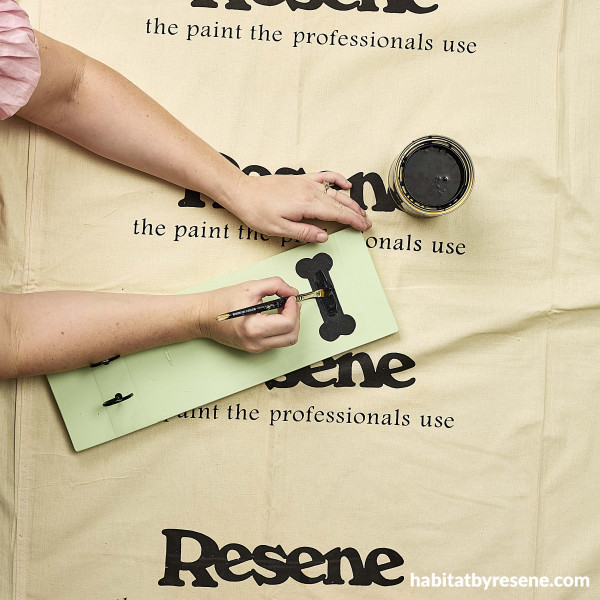 Step two: Use an artist’s brush to paint the shape for the name. Ours is in Resene FX Blackboard Paint in a dog bone shape.