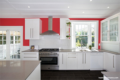 1) Paint a feature area between adjoining rooms or spaces to create a natural colour break – see the great effect Resene Guardsman Red has as a feature wall (pictured above), tying to the red fridge in the kitchen. See the full house tour here.