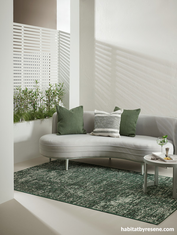 Bring warmth inside on cold days, creating a space you never want to leave – or at least curl up under a blanket for as long as you can. Pick a palette like warm, earthy tones and scatter this throughout your décor and design like in these cushions, rug and furniture from OLLO. Try cosy neutrals like Resene Triple Merino, Resene Blanc, Resene Spanish White and Resene Akaroa.