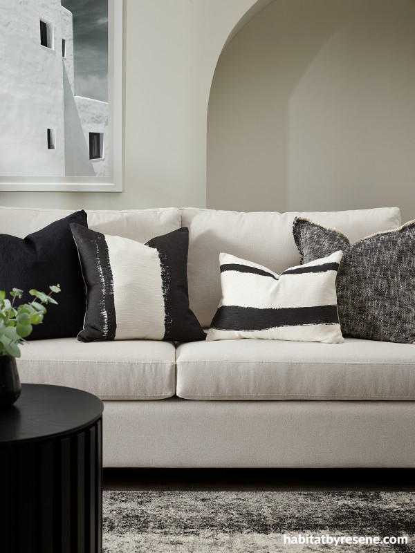 This delightful monochrome space features the Milano Black Cushion, Asher Cushion, Brooks Cushion, Arezzo Black Cushion and Quinn Floor Rug from OLLO with walls painted in Resene Half Thorndon Cream.