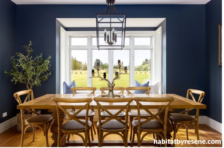 The stunning dining walls are painted in bold Resene Mine Shaft creating an intimate and cosy dining area. Ceiling painted in Resene Eighth Thorndon Cream and trims in Resene Quarter Thorndon Cream.