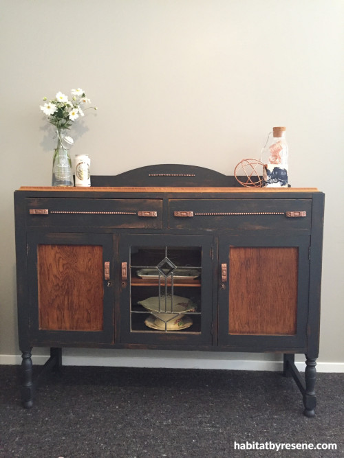 Katherine saved herself a lot of cash by breathing life into this vintage sideboard using good old fashioned elbow grease and Karen Walker Chalk Colour paint in Resene Element. The wall is painted in Resene Quarter Cougar and the trims are Resene Quarter Rice Cake.
