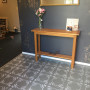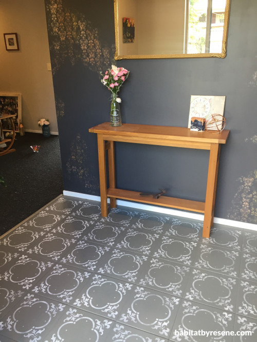 A striking feature wall in Resene Baltic Sea with stencil details in Resene Shabby Chic and Resene Gold Dust metallic greets visitors at Katherine’s two-storey townhouse. Katherine rejuvenated the tired terracotta tiles by painting the floor in Resene Walk-on in Resene Condor and stenciling a pattern in Resene Quarter Rice Cake.