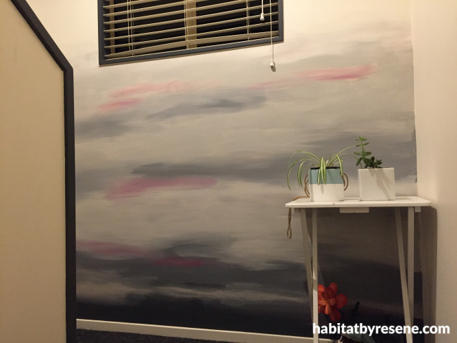 Katherine got creative in the stairwell painting a feature wall in Resene Cranberry, Resene Half Shark, Resene Tea and Resene Half Tea – as well as a few extra testpots she had on hand. The handrail on the stairs is Resene Half Shark and the wall is Resene Quarter Cougar.