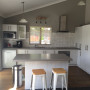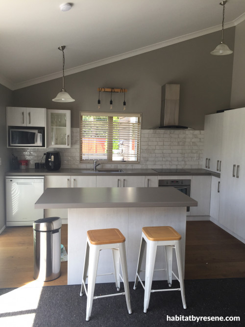 “The bench and cupboards were previously pink, there was no splashback or space for the microwave. I added more upper cabinets, tiles, extra benchtop space, a pantry and rangehood, as well as hanging lights and blinds. Painting the walls in Resene Double Truffle also goes so well with the tiles, grout and benchtop.”