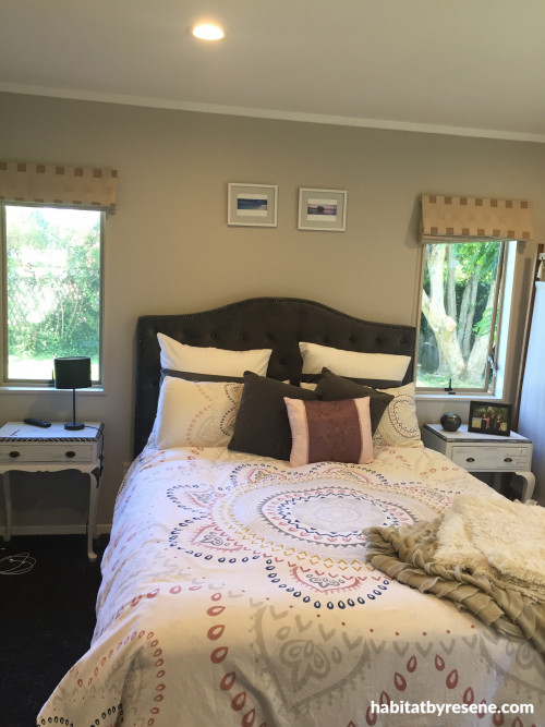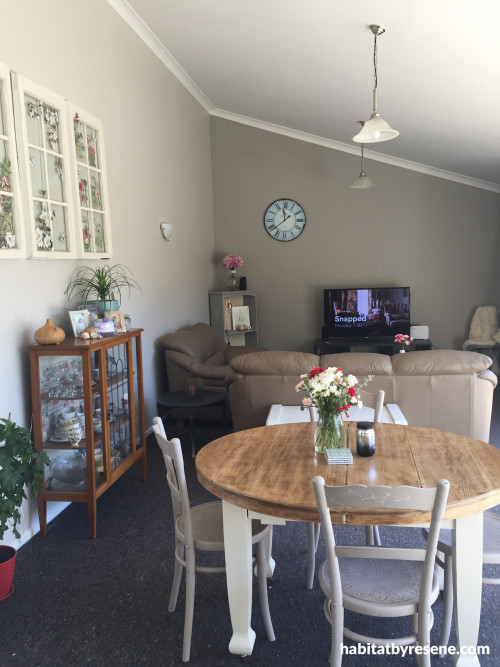 Pink be gone! One the home’s biggest transformations was in the kitchen where former pink benchtops and cupboards and walls were previously various shades of pink. They’ve been replaced with this restful but practical palette with Resene Double Truffle on the walls.