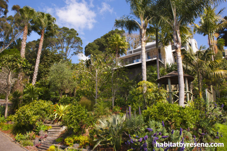 Surrounded by a lush subtropical garden, the house sits high above Orakei Basin, giving it fantastic views. The exterior is painted in Resene Quarter Pearl Lusta, with the roof in Resene Aluminium.