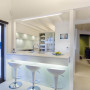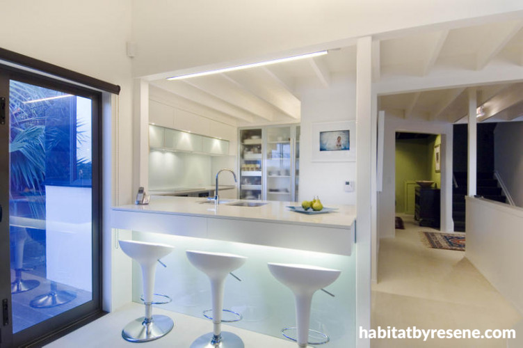The kitchen, painted in Resene Quarter Pearl Lusta, is sleek and modern.