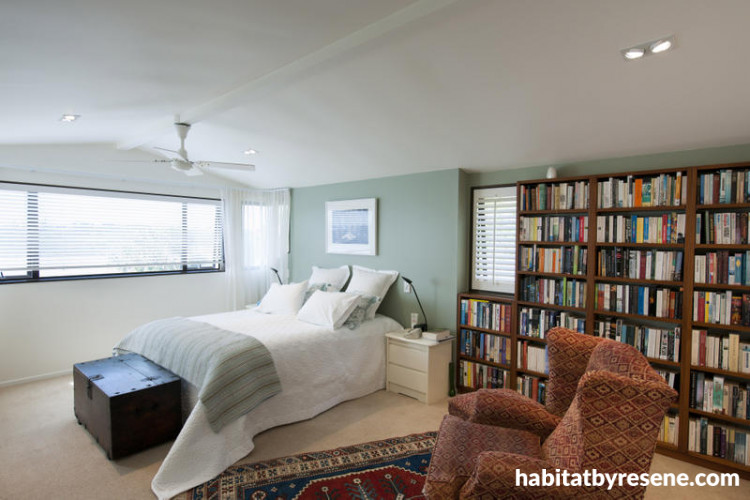 Surrounded by lush subtropical gardens, John and Margie's home sits high on a slope overlooking the calm waters of Orakei Basin. Hidden down a private lane, the house is a well-kept secret, entirely invisible from the street. Designed in the 80s by Paul Higgins, it still has a contemporary feel, thanks to John and Margie's renovations. To brighten the interior, they painted the originally dark ceilings with white Resene Quarter Pearl Lusta, making a huge difference to the space. And while they have chosen mostly soft colours for the walls (going for whites, blues and greens throughout) there is the occasional exception - such as bright orange Resene Flashback in the guest bathroom.