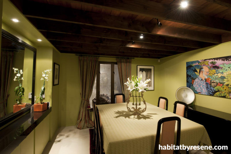 What colours did you use? The house exterior is Resene Quarter Pearl Lusta, with the front door and garage door in Resene Eternity and the roof in Resene Aluminium. (All the exterior wall colours we used were in Resene X-200 paint, the special acrylic waterproofing membrane paint, so that it will protect the house for a good long time.) All of the white interior walls, ceilings and trims are Resene Quarter Pearl Lusta. The lobby, office and feature wall in the lounge are Resene Arrowtown. The guest bedroom feature wall is Resene Bounty, the main bedroom feature wall is Resene Washed Green from the Karen Walker Paints collection, and the spa pool and garden room area is Resene Windblown Green, also from the Karen Walker Paints range. There is a feature wall of Resene Flashback in the guest bathroom.