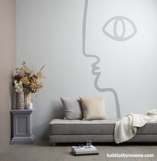 This Bauhaus-inspired mural has transformed a neutral wall in this lounge. Bauhaus designs feature little ornamentation and instead focus on balanced forms, abstract shapes and bold blocks of colours. Back wall in Resene Quarter Surrender, left wall in Resene Americano, floor in Resene Colorwood Mid Greywash, face in Resene Grey Chateau, plinth in Resene Santas Grey, lamp base in Resene Santas Grey, tall vase in Resene Americano with splatters in Resene Grey Chateau, short vase in Resene Sea Fog and jug vase in Resene Lola. Chaise and throw from Nood, cushions from H&M Home. Project by Kate Alexander, image by Bryce Carleton.