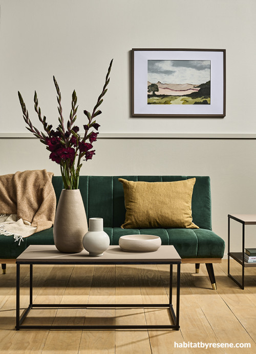 Create a soothing living space using natural tones. The base of this living space and much of its décor is neutral. And yet, the way it has been richly layered with varying tones and textures makes it both interesting and harmonious.Upper wall in Resene Half Thorndon Cream, lower wall and dado rail in Resene Double Thorndon Cream, timber floor in Resene Colorwood Natural, coffee table and side tabletops in Resene Domino, bowl in Resene Half Doeskin, large vase (with gladiolas) in Resene Dusty Road and medium bulb vase in Resene Half Thorndon Cream. DIY landscape painting in Resene Periglacial Blue, Resene Half Thorndon Cream, Resene Lemon Ginger, Resene Middle Earth, Resene Half Doeskin, Resene Domino, Resene Midnight Moss, Resene Soothe and Resene Digeridoo and picture frame in Resene Domino. Sofa from Danske Møbler, throw and cushion from Città Design. Project by Laura Lynn Johnston, image by Bryce Carleton.