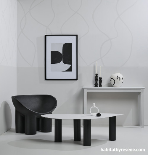 This pared-down, minimalist and achromatic look is striking with pops of colour added through artwork and furnishings, with an added pattern on the wall. Upper wall in Resene Half Concrete, lower wall and squiggle lines in Resene Concrete and floor in Resene Quarter Concrete. Hall table in Resene Concrete, DIY coffee table in Resene Triple Concrete and legs in Resene Element. Circle vase and tiny vase in Resene Soothe, tiny bud vase in Resene Triple Concrete, DIY artwork in Resene Concrete, Resene Triple Concrete and Resene Element and turned wooden candleholders in Resene Element. Chair from David Shore, vases and circle candleholder from H&M Home, circle vase from Kmart. Project by Melle van Sambeek, image by Bryce Carleton.