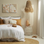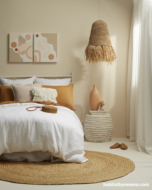 Enjoy a sweet and soothing sleep with a bedroom painted in soft character neutrals, filled with natural texture and a warming palette of colours. This Bohemian-style room glows with walls in Resene Eighth Canterbury Clay, floor in Resene Eighth Joss, lattice in Resene Eighth Pavlova, large pot in Resene Quarter Bison Hide, bedhead in Resene Eighth Joss, window trim in Resene Quarter Villa White, tall vase in Resene Beethoven and DIY artwork in Resene Sour Dough, Resene Waxflower, Resene Tuscany and Resene Beethoven. Bedlinen, lamp shade, rug, artwork, cushions, purse from Mood Store. Project by Melle van Sambeek, image by Bryce Carleton.