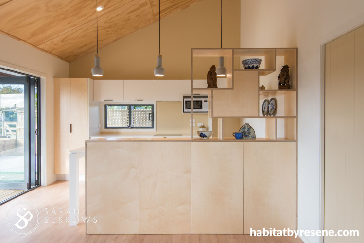 A kitchen designed by Sarah Burrows uses a wheaten Resene Haystack wall to complement rather than clash with the plywood cabinets, which are protected with Resene Aquaclear. The right-hand wall is Resene Half Villa White.