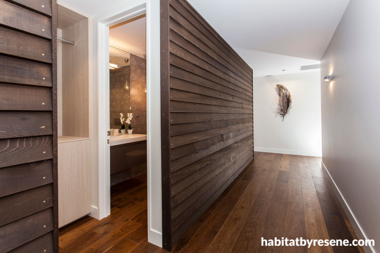 Blurring the divisions between outside and in, this striking hallway is ‘clad’ in timber which is then finished in Resene Colorwood Bushtrack. It’s in a home by master builder Gregg Builders and decorated by Newman Decorators.