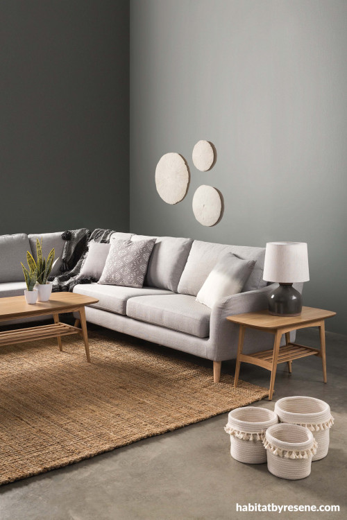 Resene Double Stack gives depth and interest to this pared back living room, featuring boho-inspired accessories from Nood. The Hampton corner sofa is also from Nood.