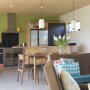 Natural elements like this plywood ceiling and cabinetry look superb with sharp greens like the Resene Kombi used on the back wall.
