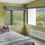 Resene Crisp Green walls used in this bedroom integrated visually with the view of bush-clad hills beyond the windows.