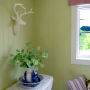Soft lettuce greens have a cottagey appeal. Here, Resene Rice Paper is used on tongue-and-groove walls. Add hints of cherry red and pale blue to complete the look.