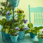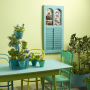 Upcycle furniture to really cultivate the botanic green look. The chair is in Resene Wheel of Fortune. The shutter and tin planter are in Resene Hope while the other planter is in Resene Freelance and the wall is Resene Fresh.