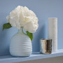 - Different gloss and texture levels in the metallic votive, vases and bedware give the eye something interesting to look at.