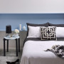 - The alternating linen in black and white is a tidy, stylish way to dress the bed.