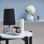 A calming spring bedroom, with walls in Resene Black White, headboard in Resene Frozen, bedside table in Resene Cut Glass and Resene All Black, and vases in Resene Quarter Alabaster, Resene White Thunder and Resene Cut Glass.