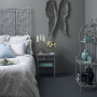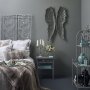 Think statement pieces, like the wings on the wall, candelabra on the side table and the tree branch bedhead. The 90s has been trending in a big way, and with those details Megan has also given a nod to the romantic gothic look that was popular in that era.