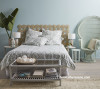 This bedroom is a tropical-inspired escape with walls in Resene Half Opal, a chair in Resene Surf Crest, and side tables in Resene Half Cut Glass, Resene Secrets and Resene Kandinsky.