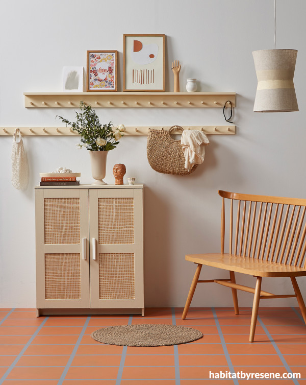 Enjoy the warmth of Tuscan tiles – without the install.This wall is painted in Resene Eighth Pearl Lusta,painted ‘tile’ floor in Resene Tuscany with grout painted in Resene Raven, cabinet in Resene Blank Canvas with doors in Resene Gold Coast with ‘cane’ in Resene Double Dutch White and hook racks and shelf in Resene Double Dutch White. Project by Kate Alexander, image by Bryce Carleton