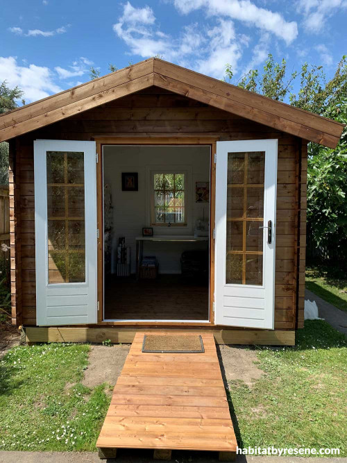 Liz painted the interior of the shed in crisp, clean Resene White and protected the timber flooring with Resene Qristal ClearFloor and added some other mod cons.