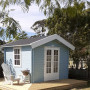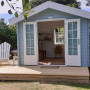 Lea’s Star Cabin SheShed cabin is painted in a Cape Cod style using Resene Botticelli with Resene Alabaster on the soffit, trims and French doors.