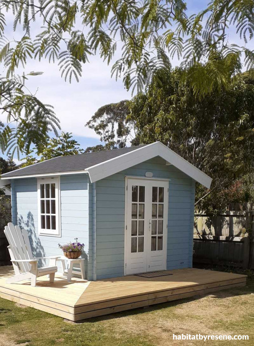 When Lea decided to create a garden studio which could also double as a sleepout for her teenage daughter, she pulled out all the stops with a Hamptons inspired design. She chose a kitset 9 sqm Star Cabin from SheShed made of kiln-dried Nordic spruce with double French doors and an Asphalt shingle roof. The kitset is compliant with most council regulations (please check your local rules) and designed to be built by two novices over a weekend. Lea enlisted the help of a handyman and family members to build the home and paint it in bright blue Resene Botticelli prior to construction.